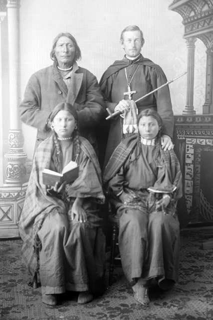 His call to the priesthood from the battlefield was not easily realized. He spent six years as a Jesuit novice, received some formation with the Benedictines, and was finally ordained in 1883 as a diocesan priest specifically to minister to the Indians in the Dakota Territory. There he enthroned the Sacred Heart of Jesus as its True Chief, signing it in his own blood. He quickly realized the corruption and competition among government agents, protestant missionaries, and Catholic hierarchy. He aggravated all of them by his outspokenness against their injustice to the Indians. He was intelligent, quick tempered and arrogant, notably paranoid, articulate in confrontations, sometimes assaultive.