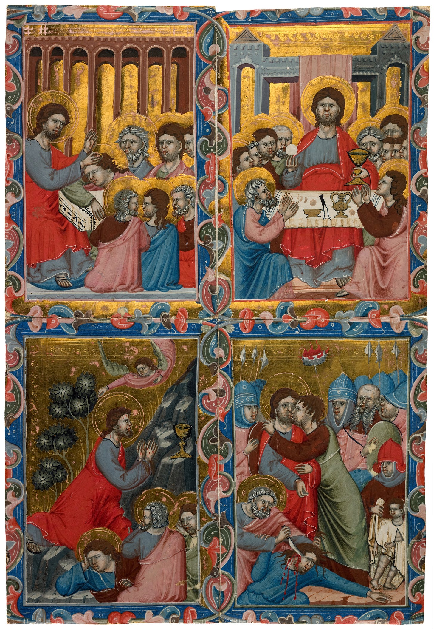 He also knew that all His apostles would soon abandon Him, even St. Peter the first pope and St. John the Beloved Disciple. Only the women would remain with Him throughout the Via Dolorosa, all the way to the Cross and the discovery of the empty tomb. He felt the weight of St. Peter’s threefold apostasy when he denied Christ, the chains of doubt and despair that prevented the other apostles from even remaining as close to Him as St. Peter, and worst of all, He felt the heart-piercing bitterness of Judas’s betrayal, his unwillingness to return to Christ and finally his suicide, for which he would suffer the ultimate penalty of eternal damnation.