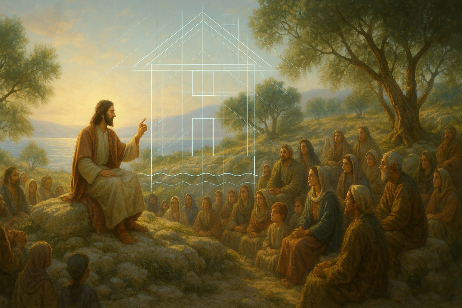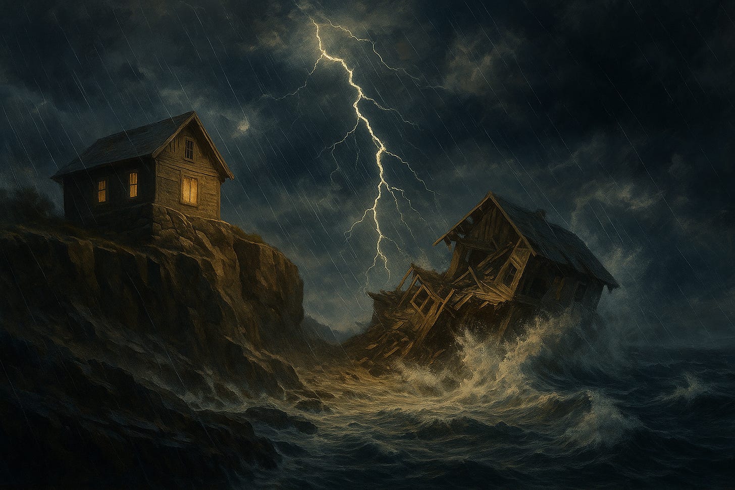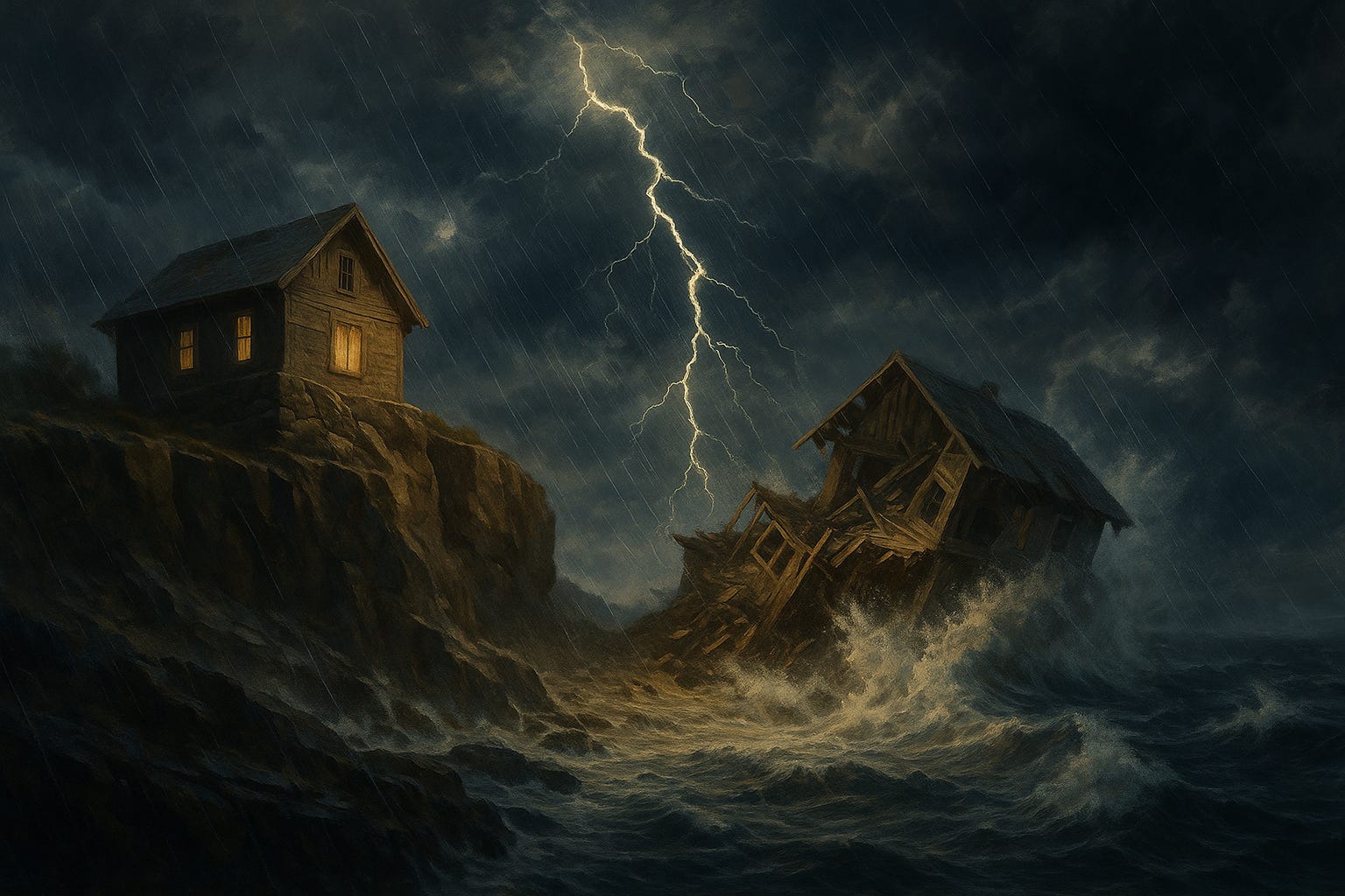 The sermon closes with a stress test. It is a picture of two houses that look fine initially then the sky opens, the torrent rises, the wind picks up, and when the storm passes only one is still standing. The difference is not schooling, money, power, or reputation; it is whether a man hears these words of Jesus and then does them. Hear without doing and the same storm that matures your neighbor will flatten you. Hear and do, and losses still come, diagnoses are still received, teenagers still push boundaries, but the frame holds because it was fastened to something stronger than your circumstances and your emotions. Jesus is deliberate when He says these words, because He means it as a whole way of life to be practiced together as a complete remodeling of your thinking—a renewal of mind and an ordering of loves. He hands you the Kingdom’s building code that is meant to outlast every storm because it is divine and eternal.